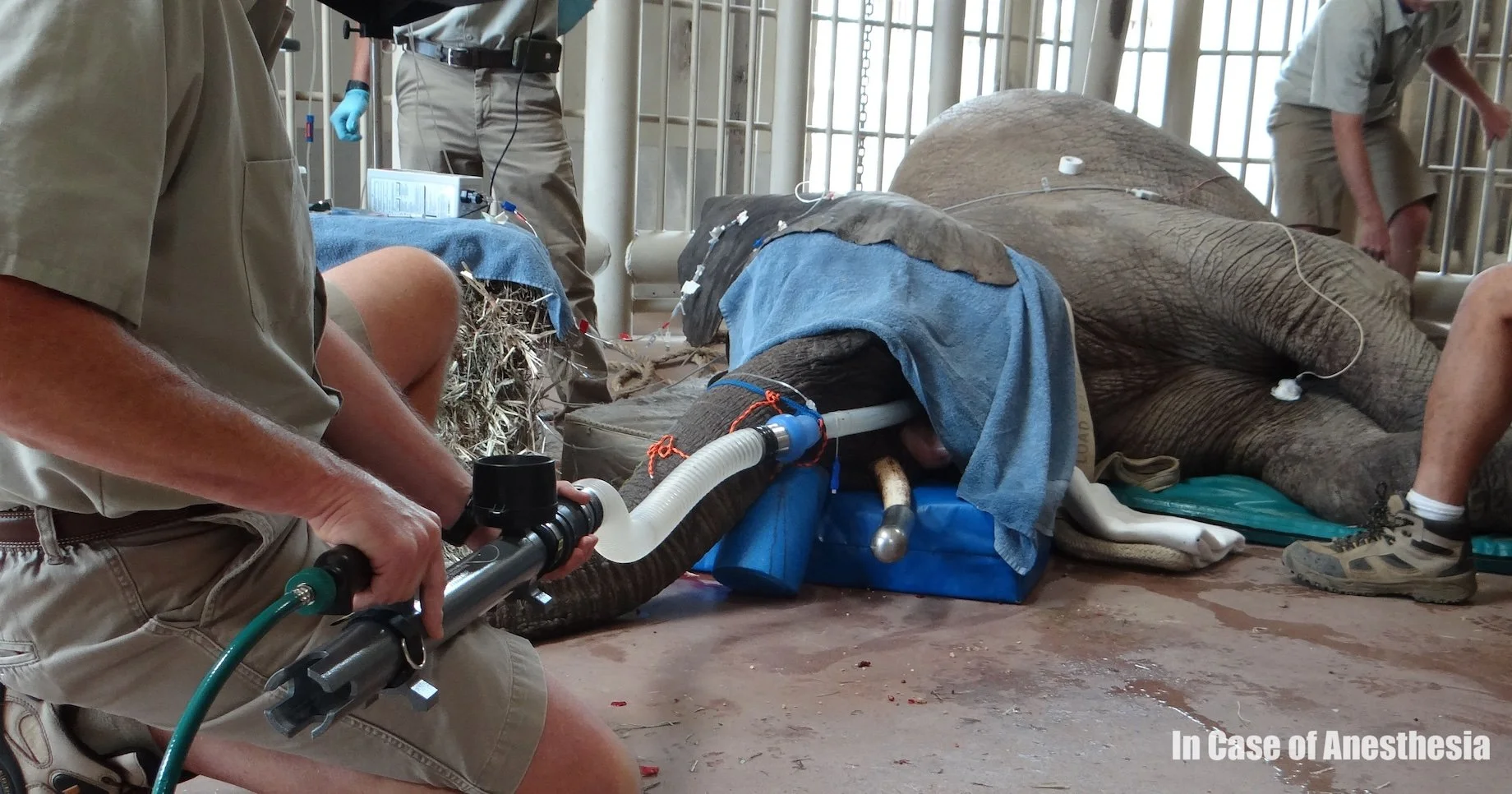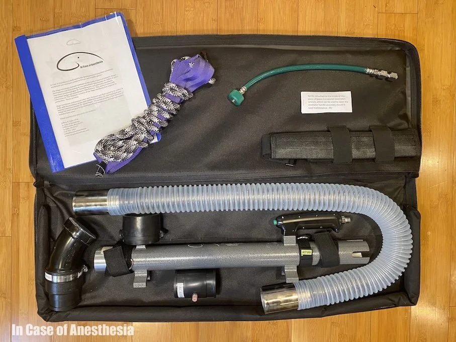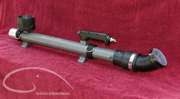 In Case of Anesthesia’s megavertebrate ventilator is a portable, compressed oxygen gas-powered, venturi enhanced, manually triggered, demand ventilator. When attached to a proper regulator and medical oxygen tank, it is capable of providing variable tidal volumes to assist ventilation in intubated mega-vertebrates from 350 kg to 7000 kg. Due to the internal venturi, the ventilator provides an FiO2 of approximately 42% at normal delivery pressures.